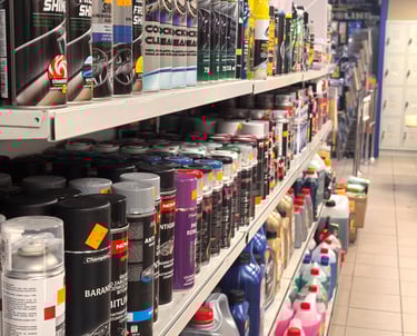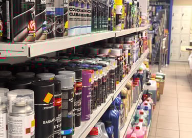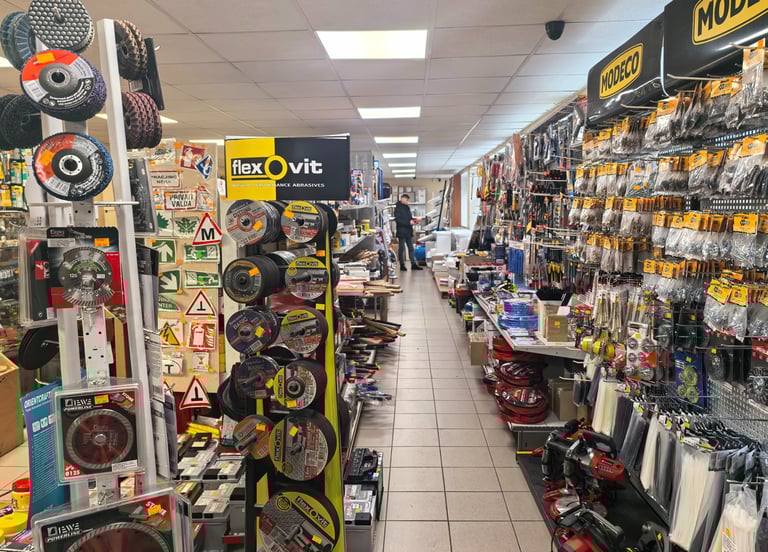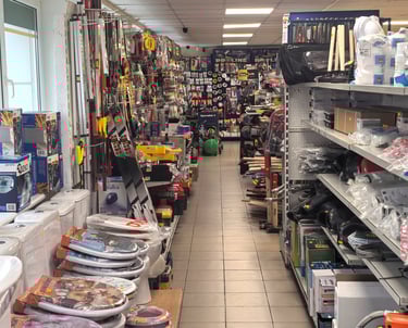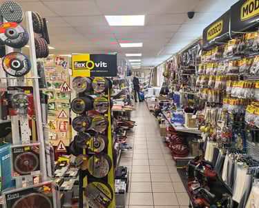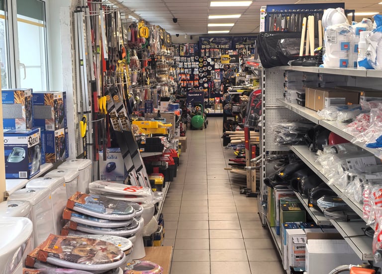 Santechnikos prekės vidaus ir lauko darbams, didelis darbo įrankių pasirinkimas, tvirtinimo elementai, autochemija, akumuliatoriai ir kitos smulkios automobilių priežiūros prekės.