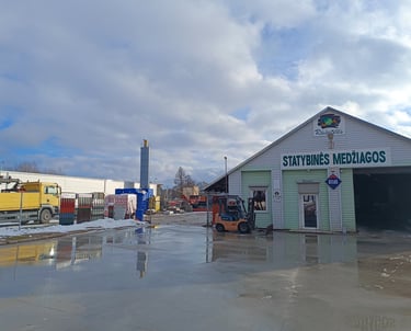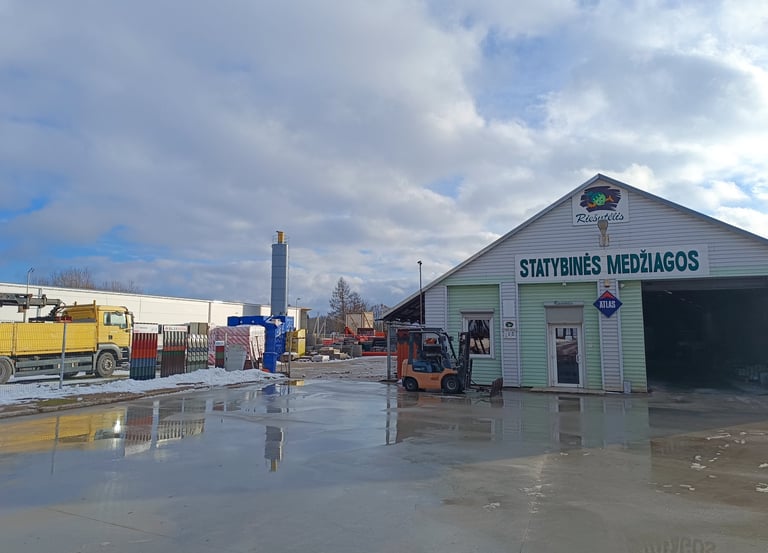 Blokeliai, plytos, šulinių žiedai, stogo dangos, statybiniai mišiniai, statybinė mediena, apdailos ir apšiltinimo medžiagos.